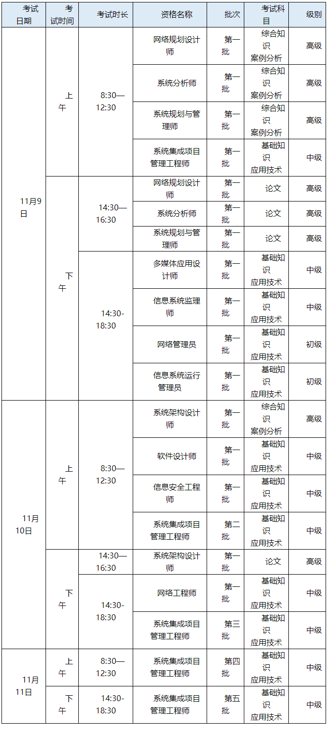 4、11月11日只安排了系统集成项目管理工程师第4批、第5批考试,其他科目均分布在11月9日-10日举行考试。