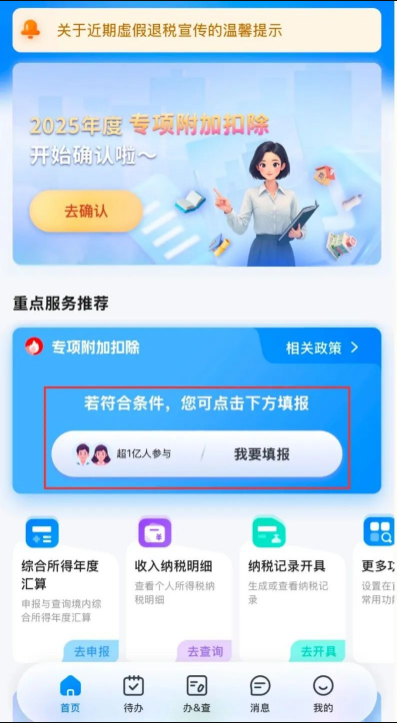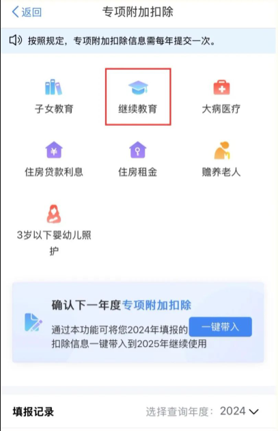 第二步:直接点击上面的“2025年度专项附加扣除开始确认啦”的轮显图,进入专项附加扣除页面后点击去确认,然后选择“继续教育”,扣除年度选择“2024”后点击确认。