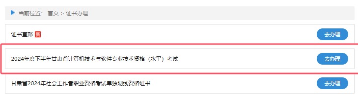根据甘肃人事考试网 < 证书办理 > 专栏了解得知,甘肃2024年下半年软考证书于2025年1月13日开始发放,合格考生可登录甘肃人事考试网,点击菜单栏“证书办理”栏目,进入“2024年度下半年甘肃省计算机技术与软件专业技术资格(水平)考试”,点击去办理即可申领证书。