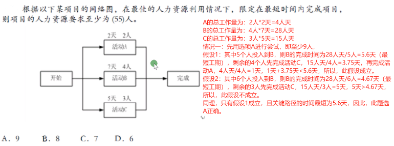 在最佳的人力资源利用情况下,限定在最短时间内完成项目,需要考虑题目上这句话的含义。