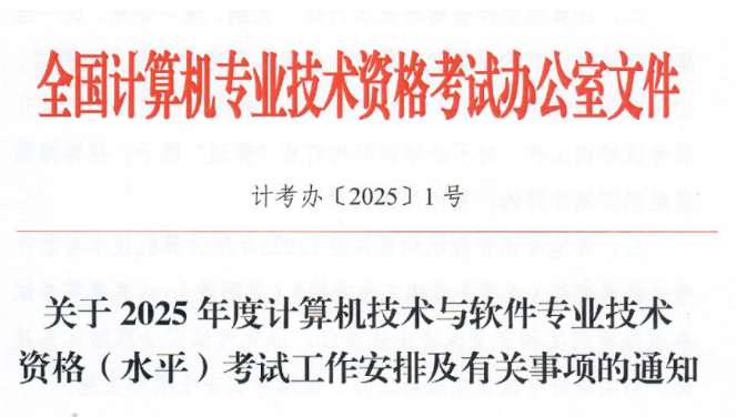 根据人力资源社会保障部办公厅《关于2025 年度专业技术人员职业资格考试工作计划及有关事项的通知》(人社厅发〔2025]1号)文件要求,为全面做好2025 年度计算机技术与软件专业技术资格(水平)考试(以下简称计算机软件资格考试)的组织实施工作,现将 2025 年度计算机软件资格考试工作安排及有关事项通知如下: