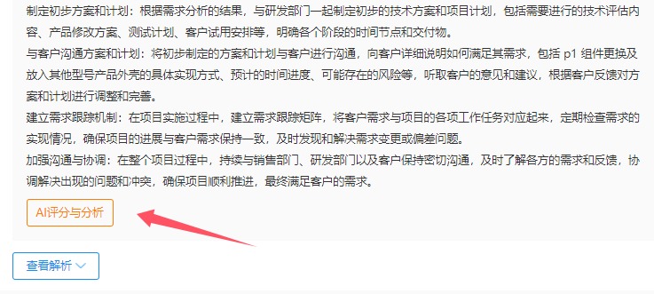 在完成作答并提交答案后,在 “我的答案” 下方,你会看到醒目的 "AI评分与分析" 的功能按钮,点击后会马上当场给出我们此次作答的答题情况与得分情况。会针对你的答案给出的得分分析,以及最终的总得分,让你对自己的答题情况一目了然。