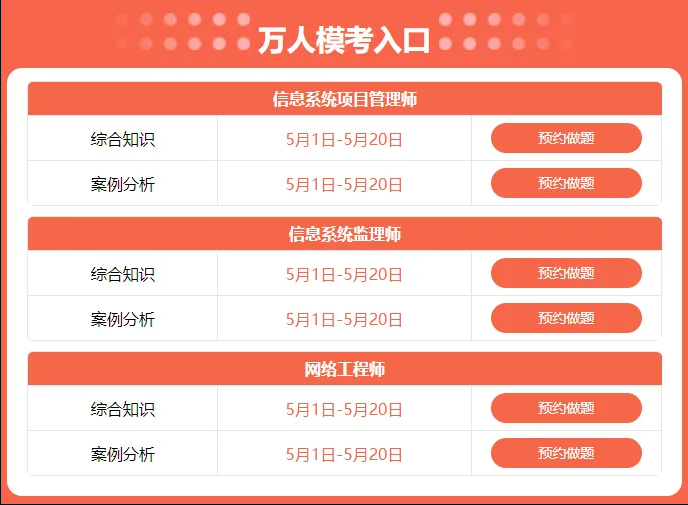 此次模考开设科目包括:信息系统项目管理师、信息系统监理师、网络工程师