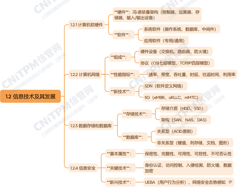 系统规划与管理师第2版教程第第一章信息系统与信息技术发展第二节信息技术及其发展考点涉及:计算机软硬件、计算机网络组成及性能指标、数据存储技术、数据库、信息安全基本属性及关键技术等内容,具体思维导图整理如下: