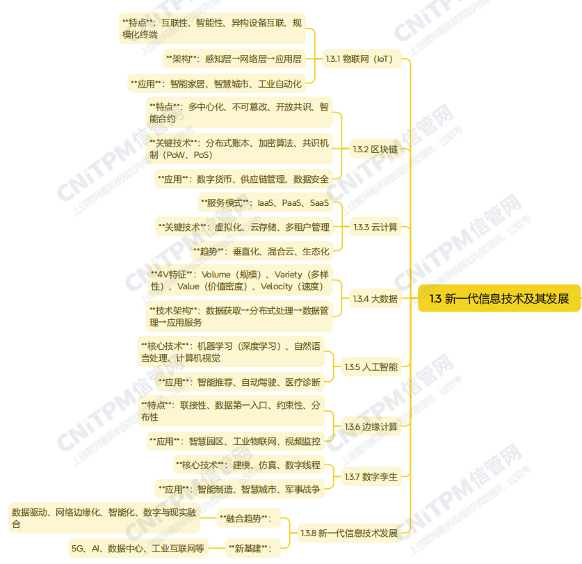 系统规划与管理师第2版教程第第一章信息系统与信息技术发展第三节信息技术及其发展考点涉及:物联网特点及架构、区块链特点及关键技术、云计算服务模式和关键技术、大数据特征、人工智能技术、数字孪生核心技术及应用、新基建等,具体思维导图整理如下: