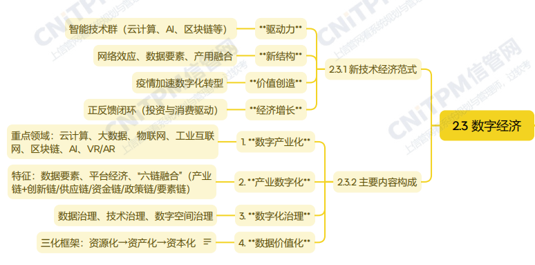系统规划与管理师第2版教程第第二章数字中国与数智化发展第二节数字经济考点涉及:新技术经济范式、数字产业化、产业数字化、数字化治理、数据价值化等,具体思维导图整理如下: