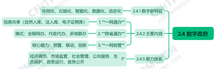 系统规划与管理师第2版教程第第二章数字中国与数智化发展第四节数字政府考点涉及:数字新特征、数字政府主要内容、数字政府能力体系等,具体思维导图整理如下: