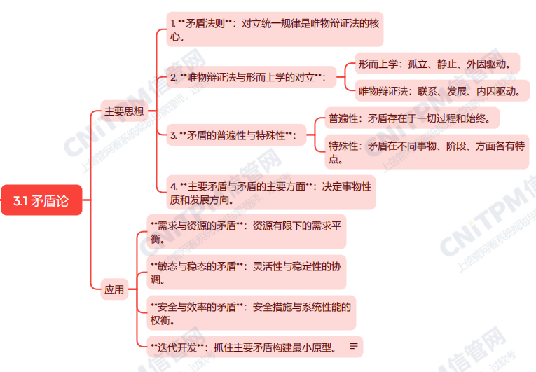 系统规划与管理师第2版教程第第三章系统科学与哲学方法论第一节矛盾论考点涉及:矛盾论主要思想、矛盾论的应用等,具体思维导图整理如下: