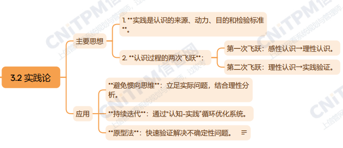 系统规划与管理师第2版教程第第三章系统科学与哲学方法论第二节实践论考点涉及:实践论主要思想、实践论的应用等,具体思维导图整理如下: