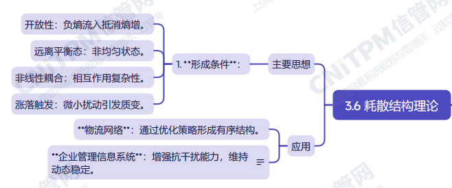 系统规划与管理师第2版教程第第三章系统科学与哲学方法论第六节耗散结构理论考点涉及:耗散结构理论主要思想、耗散结构理论的应用等,具体思维导图整理如下: