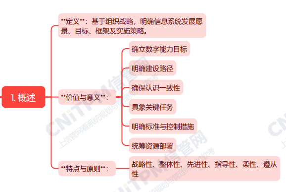 系统规划与管理师第2版教程第第四章信息系统规划第一节概述考点涉及:信息系统规划的定义、信息系统规划价值、信息系统规划特点与原则等,具体思维导图整理如下:
