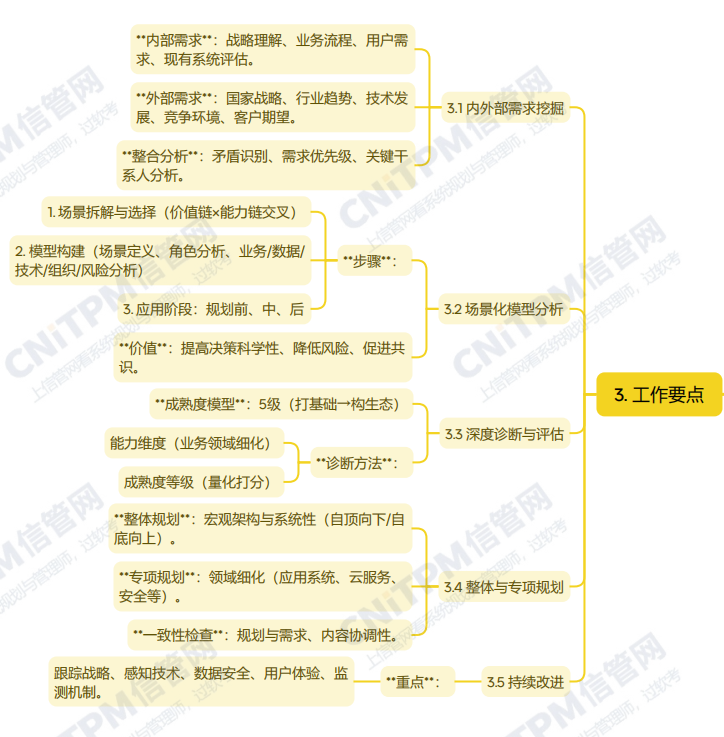 系统规划与管理师第2版教程第第四章信息系统规划第三 节工作要点考点涉及:内外部需求挖掘、场景化模型分析步骤、深度诊断与评估方法、整体与专项规划、持续改进重点等,具体思维导图整理如下: