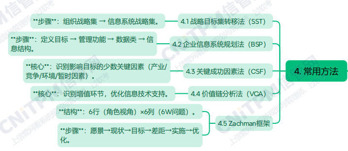 系统规划与管理师第2版教程第第四章信息系统规划第四节常见方法考点涉及:战略目标集转移法、企业信息系统规划法、关键成功因素法、价值链分析法、zachman框架等,具体思维导图整理如下: