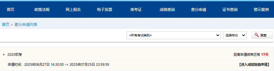 如考生确有充足理由要求复查成绩,可在规定受理时间内,通过据四川省人力资源和社会保障厅查分申请栏“2025年上半年计算机技术与软件专业技术资格(水平)考试”项点击“进入成绩复查申请”申请成绩复查。