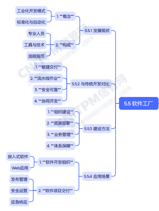 系统规划与管理师第2版教程第五章应用系统规划第五节主要内容考点涉及:软件工厂发展构成、软件工厂建设方法、软件工厂应用场景等,具体思维导图整理如下: