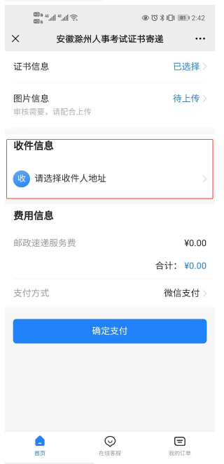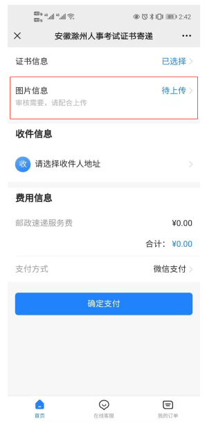 2、邮寄服务办理流程:扫描中国邮政邮寄业务二维码—填写考生信息—核对考生证书信息—上传考生本人手持身份证照片—填写收件地址—系统自动计费—线上支付—邮寄送达。