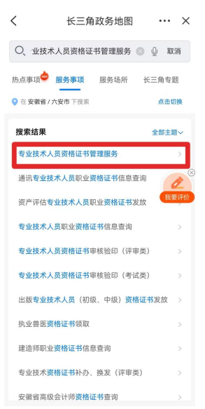 第三步:搜索服务事项 “专业技术人员资格证书管理服务”。