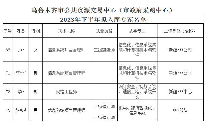 以下截图来源于《乌鲁木齐市公共资源交易中心(市政府采购中心)拟入专家库名单公示》。(注:姓名和工作单位本文截图时用*号进行了处理,完整名单大家有兴趣的话,请前往该公示原文查看)