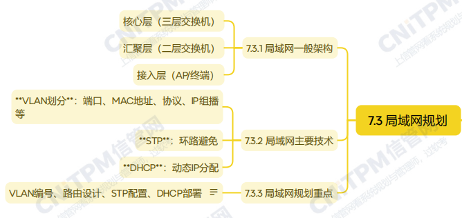 系统规划与管理师第3版教程第七章网络环境规划第三节主要内容考点涉及:局域网一般架构、局域网主要技术、局域网规划重点等,具体思维导图整理如下: