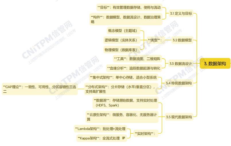 系统规划与管理师第3版教程第八章数据资源规划第三节主要内容考点涉及:数据架构定义与目标,数据模型的类型、数据流设计、传统数据架构、现代数据架构等,具体思维导图整理如下:
