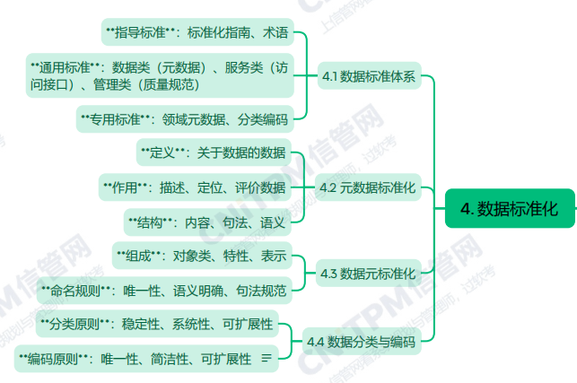 系统规划与管理师第3版教程第八章数据资源规划第四节主要内容考点涉及:数据标准体系、元数据标准化、数据源标准化、数据分类与编码等,具体思维导图整理如下: