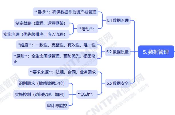 系统规划与管理师第3版教程第八章数据资源规划第四节主要内容考点涉及:数据治理、数据质量、数据安全等,具体思维导图整理如下: