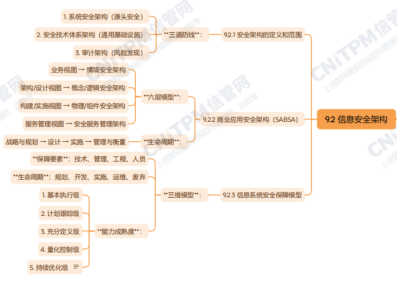 系统规划与管理师第3版教程第九章信息安全规划第二节主要内容考点涉及:安全架构的定义和范围、商业应用安全架构、信息系统安全保障模型等,具体思维导图整理如下: