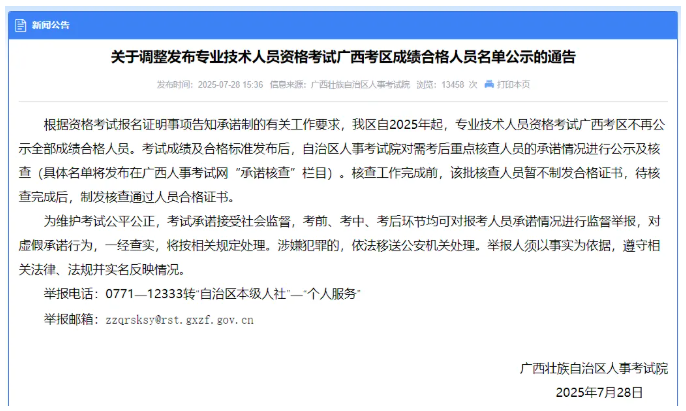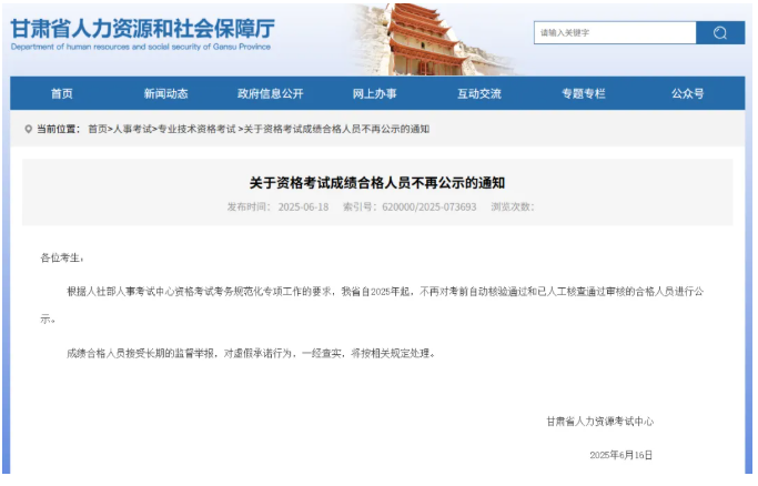 在过去两个月的时间里,包括甘肃、江苏、广西各地的考试单位相继发布了《不再公示专业技术人员职业资格考试成绩合格人员名单》的通告。