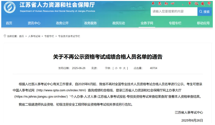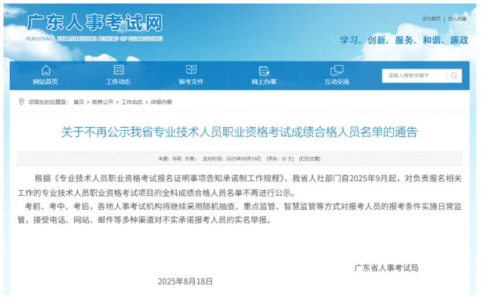 根据《专业技术人员职业资格考试报名证明事项告知承诺制工作规程》,我省人社部门自2025年9月起,对负责报名相关工作的专业技术人员职业资格考试项目的全科成绩合格人员名单不再进行公示。