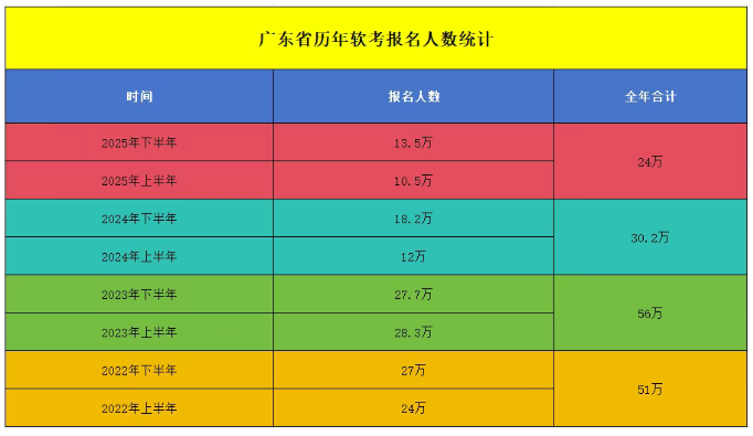 众所周知,对于广东考区而言,绝大部分的考生报名参加软考在于想通过软考 "以考代评" 的证书属性,通过考取证书获得相应职称,从而实现职称落户,而上述的两门科目,因其考试科目所具有的 "重理论,轻技术" 的属性,吸引到了不少的非IT专业技术的相关人才报名,而自2024年开始,信息系统项目管理师和系统集成项目管理工程师在考试频次上,由以前的一年考两回削减到了一年只考一回,这在一定程度上对报名人数产生了影响。