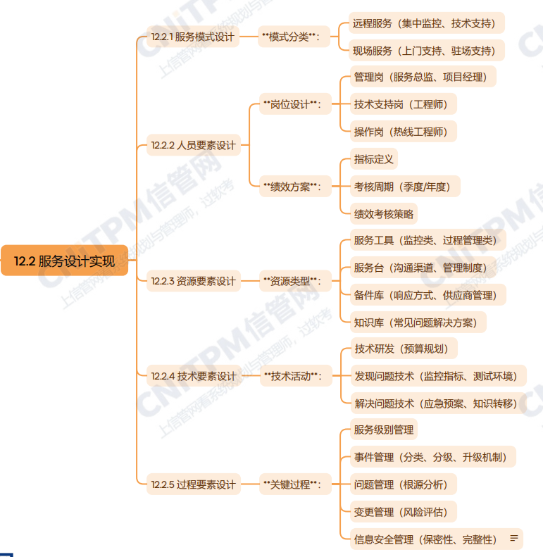 系统规划与管理师第3版教程第十二章服务战略规划第二节主要内容考点涉及:服务模式设计、人员要素设计、资源要素设计、技术要素设计、过程要素设计等,具体思维导图整理如下: