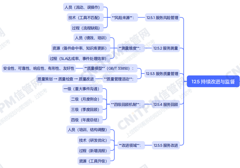 系统规划与管理师第3版教程第十二章服务战略规划第五节主要内容考点涉及:服务风险管理、服务测量、服务质量管理、服务回顾、服务改进等,具体思维导图整理如下:
