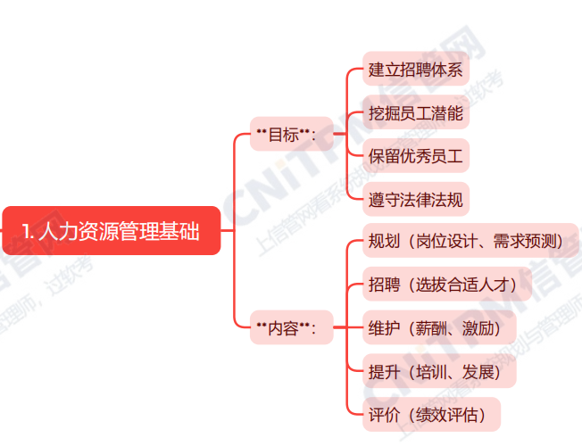 系统规划与管理师第3版教程第十三章人员管理第一节主要内容考点涉及:人力资源管理的目标、人力资源管理的内容等,具体思维导图整理如下: