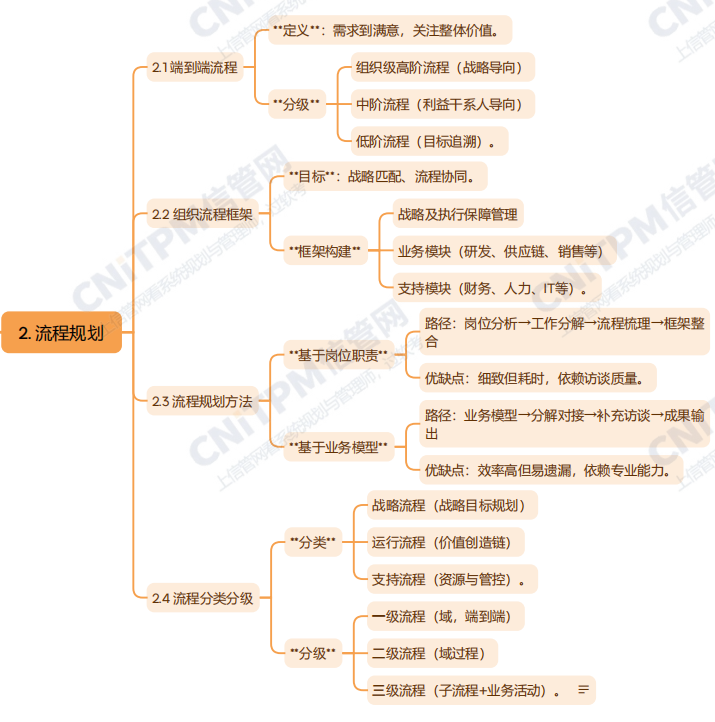 系统规划与管理师第3版教程第十四章规划与过程管理第二节主要内容考点涉及:端到端流程、组织流程框架、流程规划方法、流程分类分级等,具体思维导图整理如下: