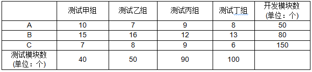 某公司为一集团开发OA系统,该系统由多个功能模块组成,共涉及三个开发环境A、B、C。全部模块测试工作由甲、乙、丙、丁4个小组共同负责。由于各组技术水平存在差异,各组在规定时间内能完成测试的模块个数不相同。各个开发环境下开发的模块数量、各小组对不同开发环境下开发的模块进行测试所需的单个成本 (单位:千元)和每个测试小组的测试的模块数量如下表所示。