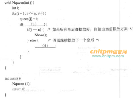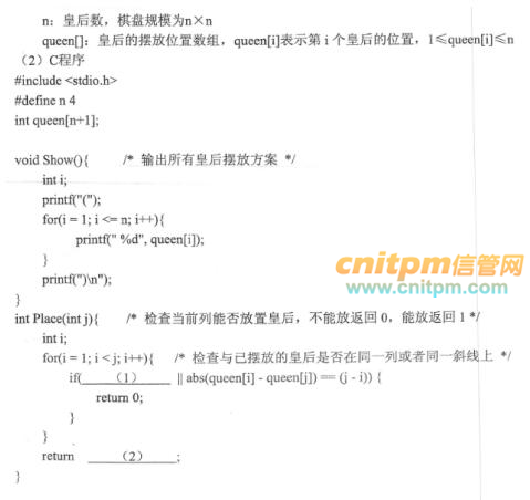 问题 1 (1) queen[i] +queen[j] == i+j (2) 1; (3) j=0:j<=i:j++ (4) place(j)
