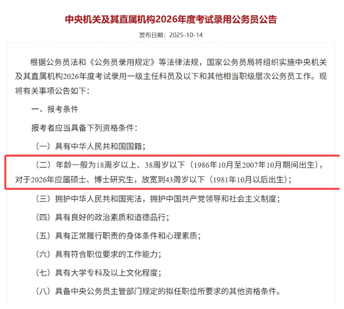 近日,中央机关及其直属机构2026年度考试录用公务员报名工作已正式启动,计划招录3.81万人,与往年相比,国考有显著变化,报考年龄上限由35岁放宽至38岁,26年应届硕士、博士更是放宽至43岁。