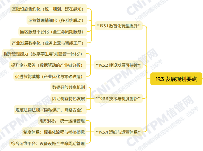 系统规划与管理师第3版教程第十九章智慧园区发展规划第三节主要内容考点涉及:数智化转型提升、建设发展可持续、技术与制度创新、运维与运营体系等,具体思维导图整理如下: