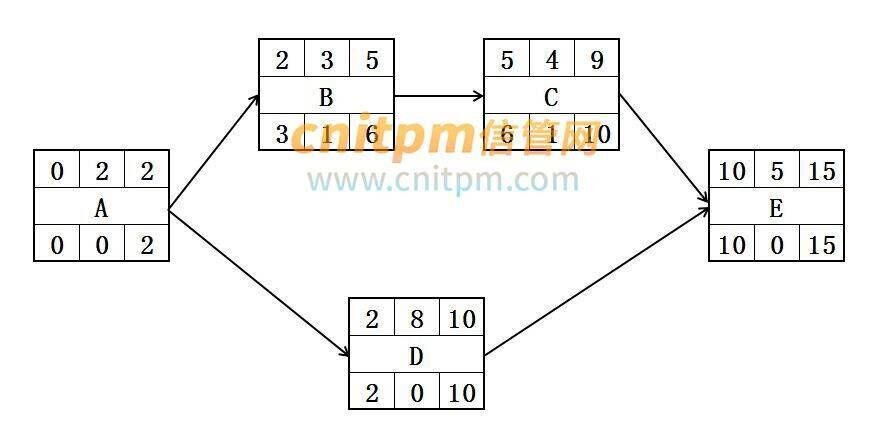在下面的项目网络图中(时间单位为天),活动B的自由时差和总时差分别为(1),如果活动A的实际开始时间是5月1日早8时,在不延误项目工期的情况下,活动B最晚应在(2)前结束