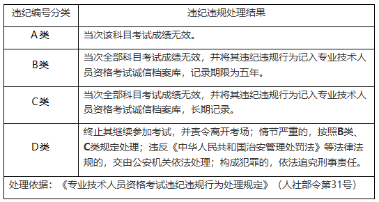 根据《专业技术人员资格考试违纪违规行为处理规定》(人力资源和社会保障部令第31号)第六条、第七条、第八条、第九条、第十条、第十一条、第十二条规定,考试期间违纪违规行为依情节轻重给予如下处理: