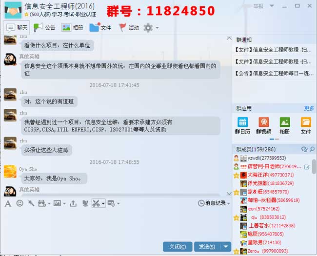 信息安全工程师将于11月12日首次开考,由于是首次考试,网络上资料比较少,为便于各位考友分享资源、交流学习,共同进步,JRS直播特建立信息安全工程师QQ交流群,群号是: 11824850 ,目前群已有考友300多人,群共享提供了信息安全工程师教程电子版下载,信息安全工程师试题下载以及其它一些资料供考友免费下载。