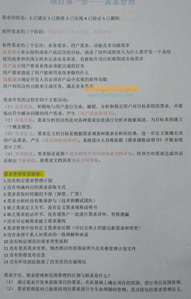 (举例:需求管理常见错误:1没有制定需求管理计划2没有明确对应的需求获取方式3需求获取时挖掘的不深(深度、广度)4需求分析时没有集体参与(技术和测试团队)5没有编写需求规格说明书6没有进行需求评审,导致遗漏7没有对定稿需求建立需求基线8需求管理中没有定义需求冻结期9没有制定规范的需求变更流程10没有更具需求变更,修改相应的范围说明书及其他管理计划文件11没有及时发布信息12没有及时跟踪批准了的变更的实施情况)