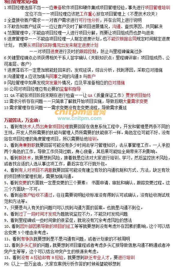 4.我最怕的问答题是“是什么”?项目章程的输入是什么?项目收尾阶段的主要工作是什么?这个没有办法,主要靠自己看和背,能记多少是多少,同时祈祷,考试时多问几个错在哪里?少问几个是什么?