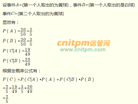第二个人取到黄球的概率=第一人取到白球第二人取到黄球的概率+第一人取到黄球球第二人取到黄球的概率=(30/50)*(20/49)+(20/50)*(19/49)=2/5