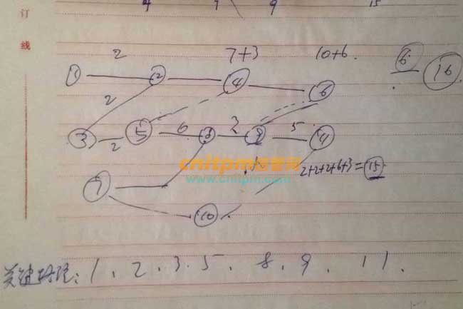 关键路径是1-2-3-5-8-9-11,当8-9时是15周,当4-6延期3周是,9的紧前活动是16周,故会增加1周