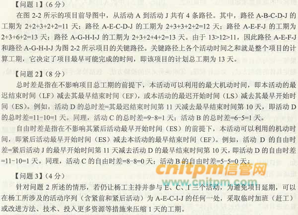 根据上面的前导图,活动C的总时差为(1)天,自由时差为(2)天。杨工是该项目的关键技术人员,他同一时间只能主持并参加一个活动。若杨工要主持并参与E、C、I三个活动那么项目工期将比原计划至少推迟(3)天。在这种情况下杨工所涉及的活动序列(含紧前和紧后活动)为(4) 。