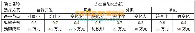 66、某机构拟进行办公自动化系统的建设,有四种方式可以选择:①企业自行从头开发;②复用已有的构件;③外购现成的软件产品;④承包给专业公司开发。针对这几种方式,项目经理提供了如下表所示的决策树。其中在复用的情况下,如果变化大则存在两种可能,简单构造的概率为0.2,成本约31万元;复杂构造的概率为0.8,成本约49万元。据此表,管理者选择建设方式的最佳决策是()。