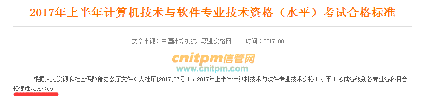 2017年上半年软考信息系统项目管理师成绩已于7月10日开通查询(查询地址),相信大部分考生都已经查询到了成绩,成绩知道了,现在大家比较关心的就是合格标准是多少了,目前合格标准已发布, 根据人力资源和社会保障部办公厅文件(人社厅[2017]87号),2017年上半年计算机技术与软件专业技术资格(水平)考试各级别各专业各科目合格标准均为45分。