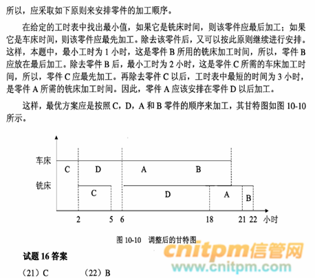 若以A,B,C,D零件顺序安排加工,则共需32小时。适当调整零件加工顺序,可使所需总工时最短。在这种最短总工时方案中,零件A在车床上的加工顺序安排在第 (21) 位,四个零件加工共需 (22)小时。