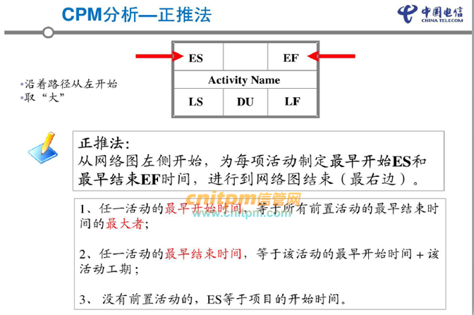 2)最早结束时间(EF):某项活动能够完成的最早时间。EF=ES+工期估算